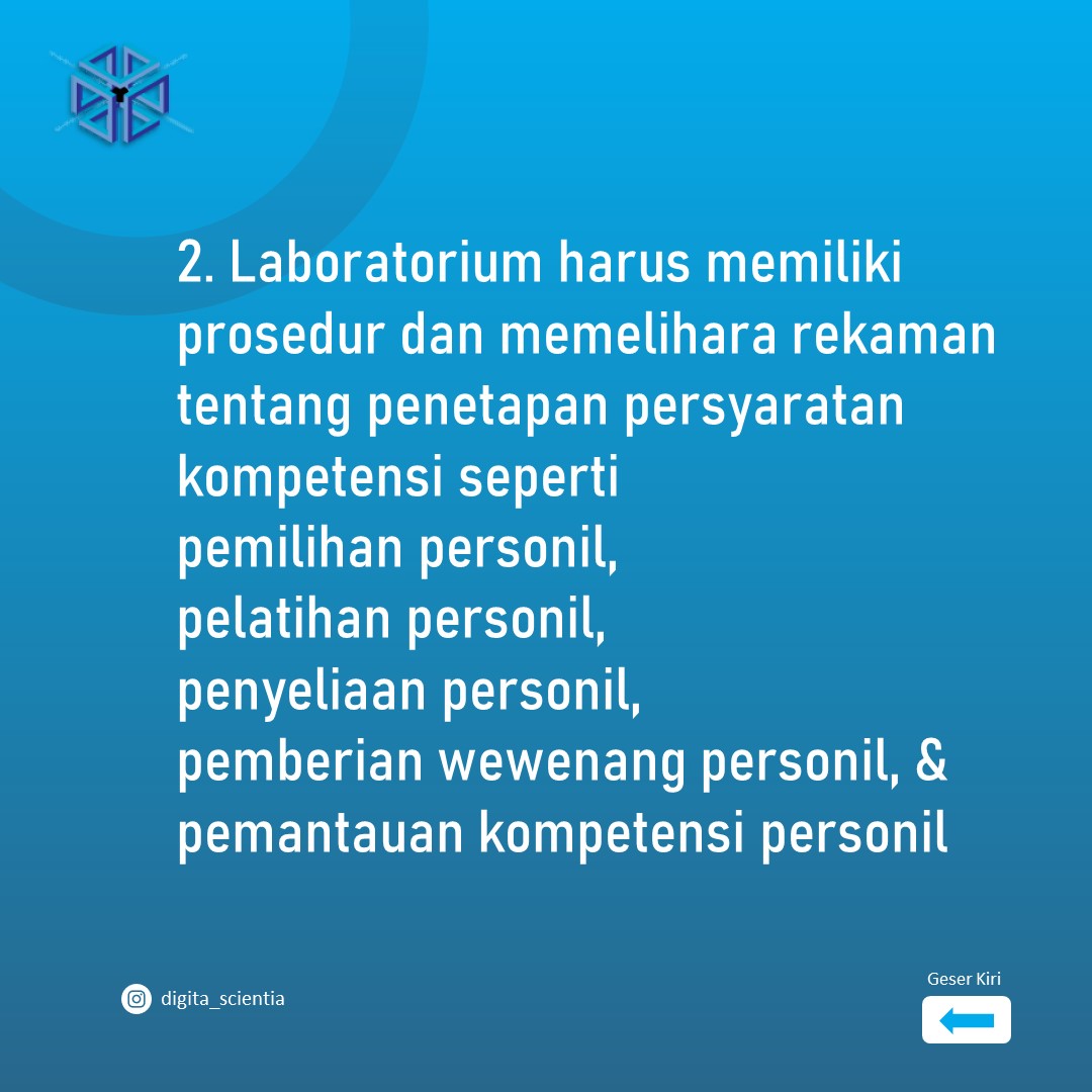 2. Laboratorium harus memiliki prosedur dan memelihara rekaman tentang penetapan persyaratan kompetensi seperti pemilihan personil, pelatihan personil, penyeliaan personil, pemberian wewenang personil, & pemantauan kompetensi personil